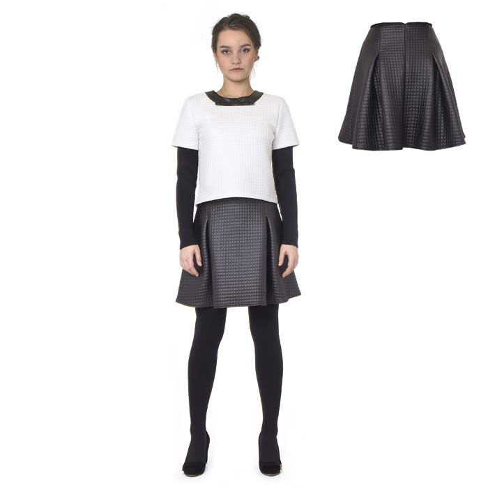 Юбка для девочки из трикотажного материала чёрного цвета, с выработкой под кожу. Силуэт расширенный. Длина выше линии колена на 6-7см. На задней половинке застёжка на молнию. Верхний край юбки окантованн элластичной резинкой