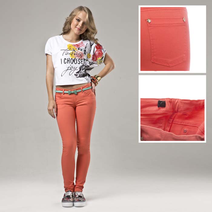 Брюки для девочки из текстиля кораллового цвета. Силуэт SLIM. В пояс проложена регулируемая элластичная тесьма-резинка.