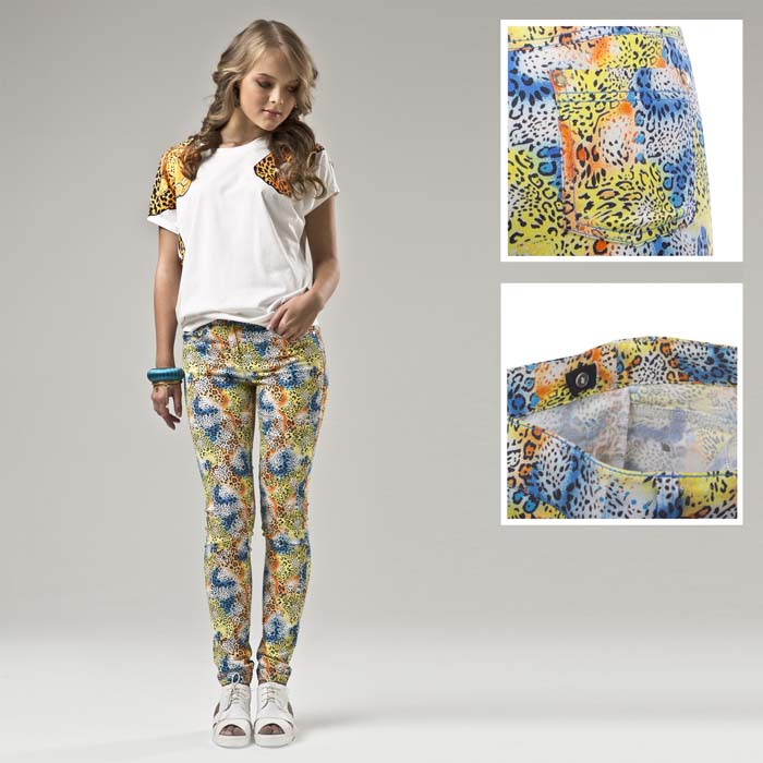 Брюки для девочки из текстиля с разноцветной набивкой. Силуэт SLIM. Посадка стандартная. В пояс проложена регулируемая элластичная тесьма-резинка.