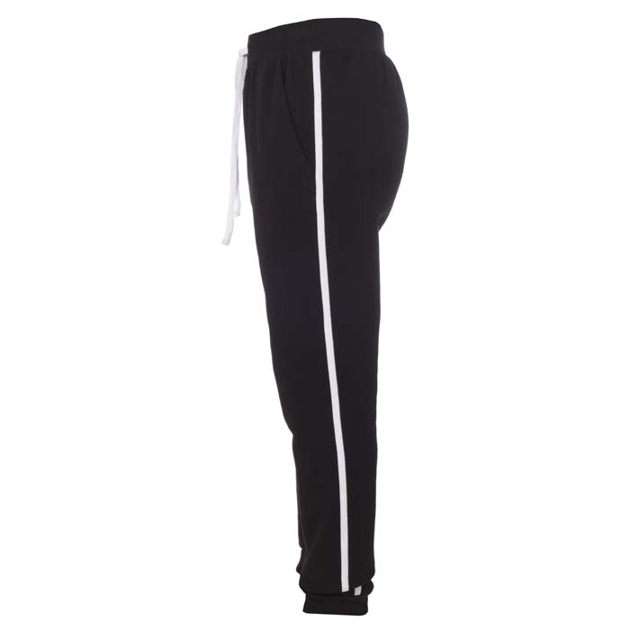 Брюки для девочки из трикотажного полотна футер 2-х ниточный черного цвета,с отделкой из трикотажного полотна белого цвета .Пояс и манжеты внизу выполнены из рибаны,В пояс проложен шнур через люверсы,Два внутренних кармана.