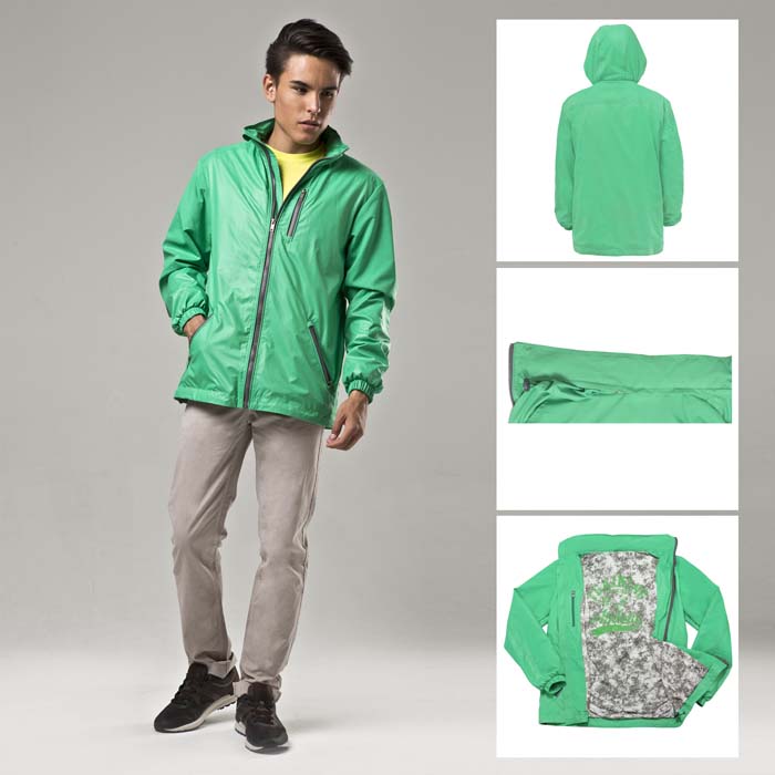 Ветровка для мальчика из курточного текстиля зелёного цвета, с водо-ветро-термо пропиткой. Силуэт REGULAR. Длина стандартная. Рукава на текстильной подкладке. Подкладка ветровки из трикотажной кулирки с принтом серого цвета. Боковые карманы и верхний карман застёгиваются на молнию. Капюшон ветровки убирается в воротник-стойку под молнию. В притачные манжеты рукавов проложена элластичная тесьма-резинка. По низу ветровки проложена шляпная резинка с фиксаторами. На подкладке полочки внутренний карман на молнии. На внутреннем пластроне и на подкладке выполнен принт экокрасками