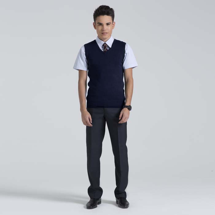 Жилет унисекс из вязанного трикотажа тёмно-синего цвета. "У" образный вырез горловины.