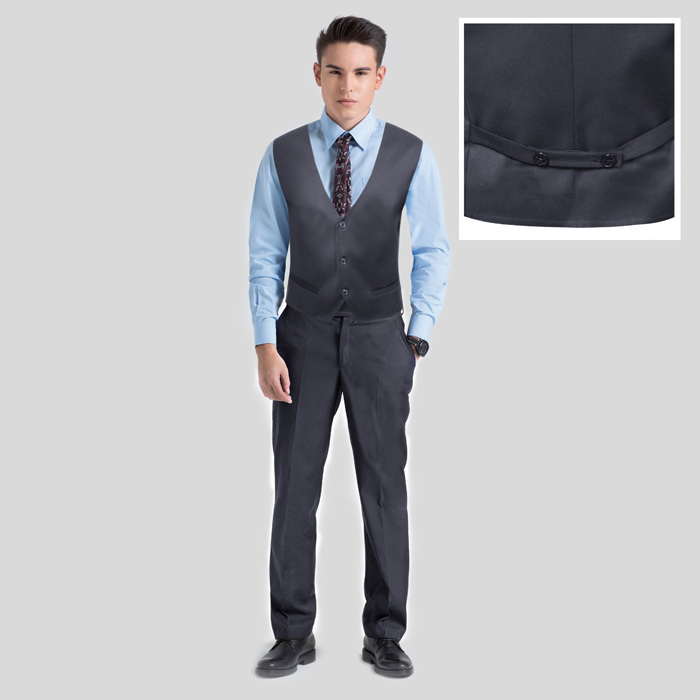 Жилет для мальчика из текстиля серого цвета. Застежка на пуговицы. На ПП два прорезных кармана в листочку.Сзади хлястик.На подкладке.