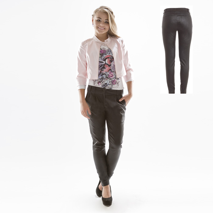 Брюки для девочки из трикотажного джерси чёрного цвета. Силуэт SLIM. Посадка стандартная. На передних половинках боковые карманы. На задних половинках кокетки и два накладных кармана. В пояс проложена регулируемая резинка.