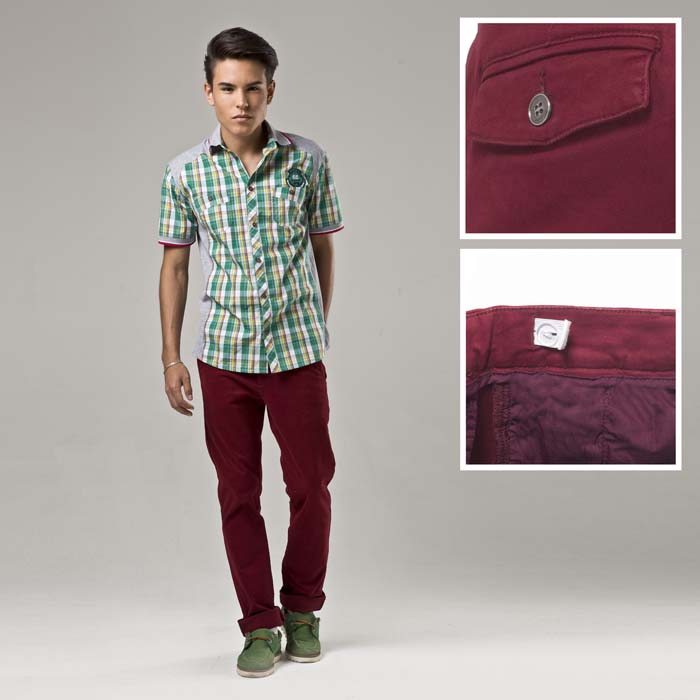 Брюки для мальчика из джинсовой ткани бордового цвета. Силует REGULAR.Посадка стандартная. На передних половинках два внутренних кармана,На задних два внутренних с клапаном.