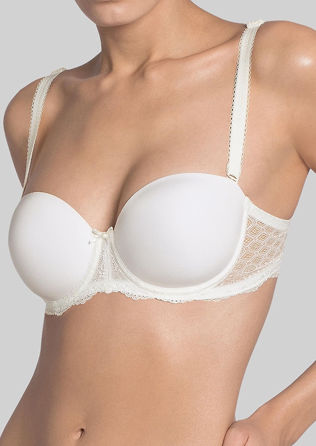 изделие выполнено из изделие выполнено из тонкого трикотажа в сочетании с кружевом, регулируемые съемные бретели, уплотненная чашка, косточки под грудью по форме груди
