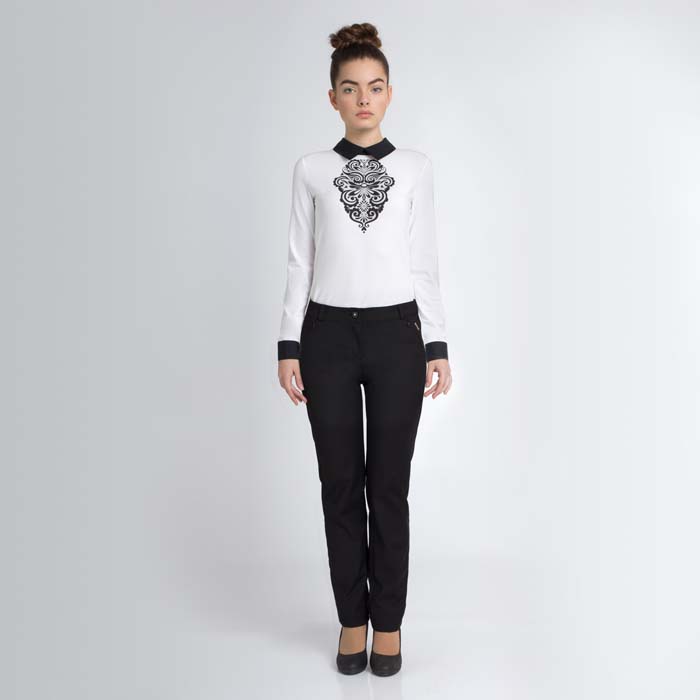 Блуза для девочки из трикотажной кулирки белого цвета. Длина стандартная. Силуэт SLIM. Притачные манжеты и воротник из текстиля контрастного цвета. На спинке потайная застёжка на молнию. На полочке принт выполнен экокрасками