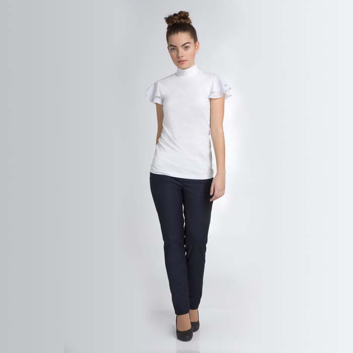 Блуза для девочки из трикотажной кулирки белого цвета. Длина стандартная. Силуэт SLIM. Рукава-воланы из искусственного шёлка