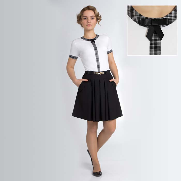 Блуза для девочки из трикотажной кулирки белого цвета. Длина стандартная. Силуэт прямой. Обтачка горловины, вставка полочки, манжеты из текстиля контрастного цвета. На спинке застёжка на пуговицу