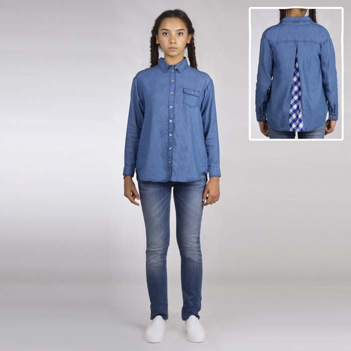Батник для девочки из тонкой джинсовой ткани синего цвета. Длина на 5 см длиннее стандартной. Силуэт расширенный. На полочке накладной карман с клапаном и застёжкой на пуговицу. Застёжка планка полочек на пуговицы. На спинке встречная складка. Вставка спинки, внутренняя стойка и внутренний манжет контрастного цвета. Рукава на манжете с застёжкой на пуговицы