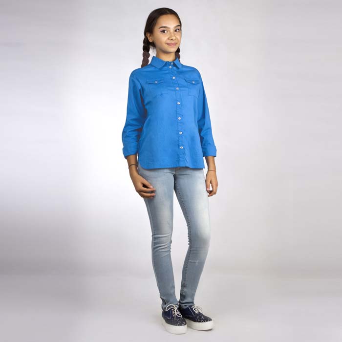 Батник для девочки из текстиля синего цвета. Длина стандартная. Силуэт прямой. Застёжка планка полочек на пуговицы. На полочках накладные карманы с клапаном, с застёжкой на пуговицы. Рукава на манжете с застёжкой на пуговицы. Батник выполнен с применением технологии "стирка"