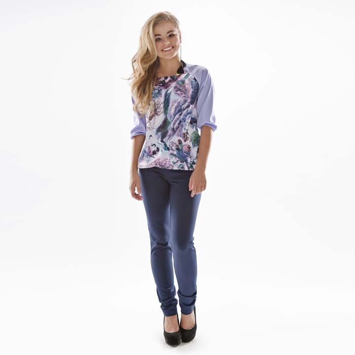 Блуза для девочки из атласа сиреневого цвета. Силуэт расширенный. Длина стандартная. Полочка из атласа контрастного цвета. Рукав реглан длиной 3/4. На спинке по горловине застёжка на пуговицу. По низу рукавов и по низу блузы проложена резинка.
