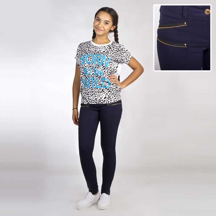 Брюки для девочки из ткани суперстрейч тёмно-синего цвета. Посадка стандартная. Силуэт SLIM. В пояс проложена регулируемая резинка. На передних половинках карманы на молнии