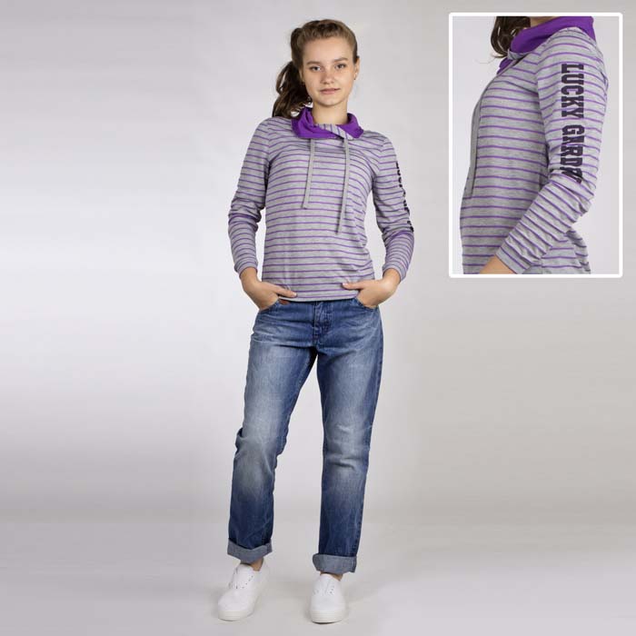 Джемпер для девочки из трикотажной кулирки цвета серый меланж в сиреневую полоску . Длина стандартная. Силуэт REGULAR. В воротник-хомут продет шнур. Внутренний воротник контрастного цвета. На левом рукаве принт выполнен экокрасками.