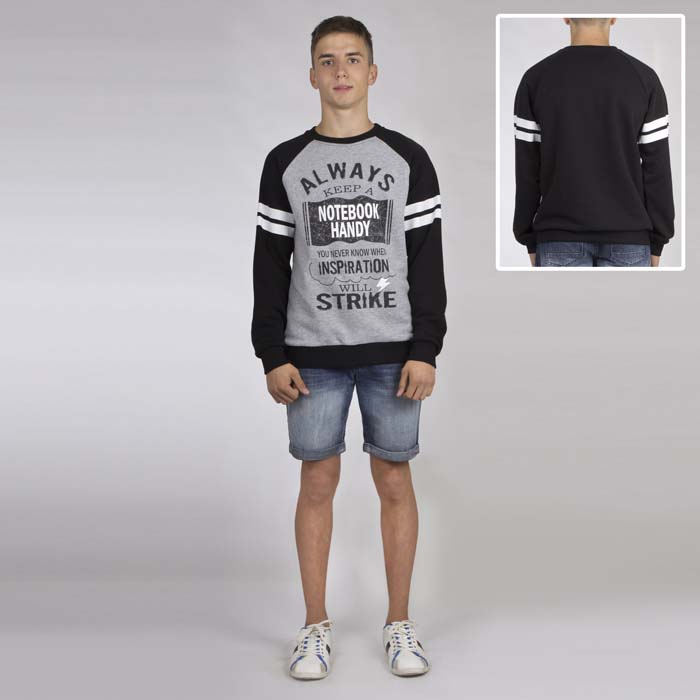 Джемпер для мальчика из футера чёрного цвета. Длина стандартная. Силуэт REGULAR. Рукав реглан. Полочка контрастного цвета. Притачной пояс и манжеты из отделочного материала. Принт полочек выполнен экокрасками