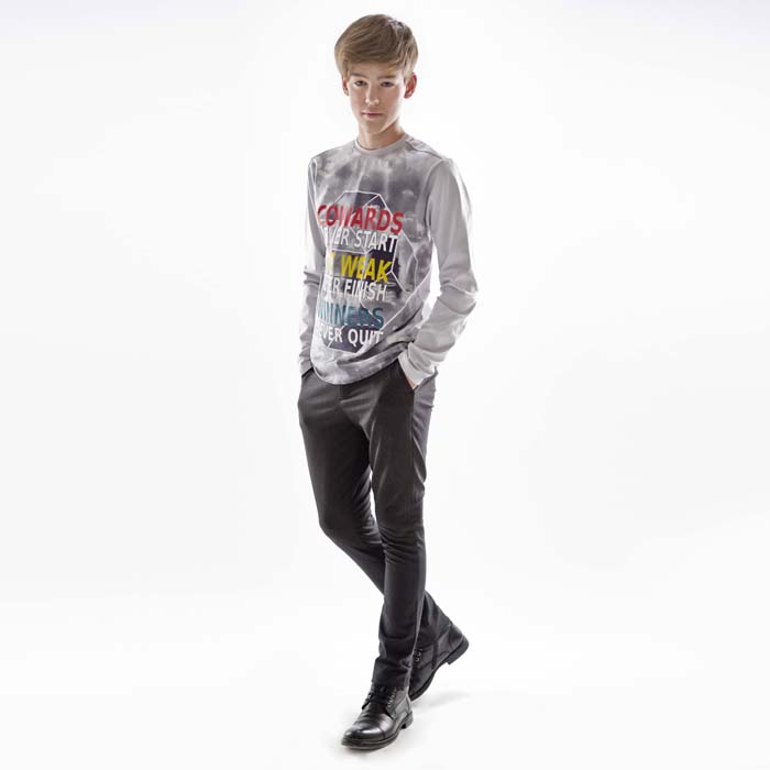 Джемпер для мальчика из трикотажной кулирки серого цвета. Силуэт REGULAR. Длина стандартная. На рукавах в области локтя отделочные детали контрастного цвета. Принт полочки выполнен экокрасками.