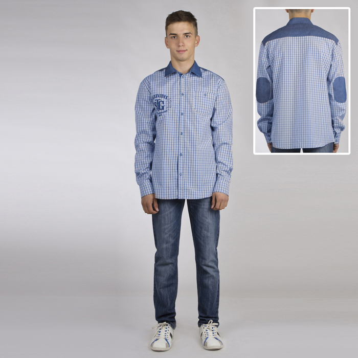 Рубашка для мальчика из текстиля в синюю клетку. Длина стандартная. Силуэт REGULAR. Застёжка планка полочек на пуговицы. На полочке накладной карман. Кокетка, накладные детали в области локтя из текстиля контрастного цвета. Принт на правой полочке выполнен экокрасками