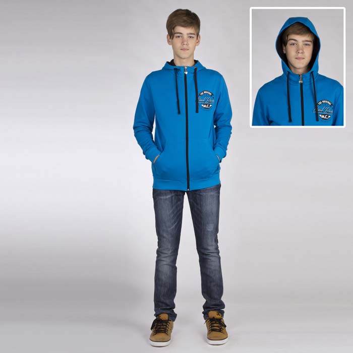 Толстовка для мальчика из трикотажного футора бирюзового цвета. Длина стандартная. Силуэт REGULAR. Застёжка на молнию. На полочке накладные карманы. Притачной пояс по низу, манжеты из отделочного трикотажного материала. В капюшон продет шнур. Принт полочка выполнен экокрасками