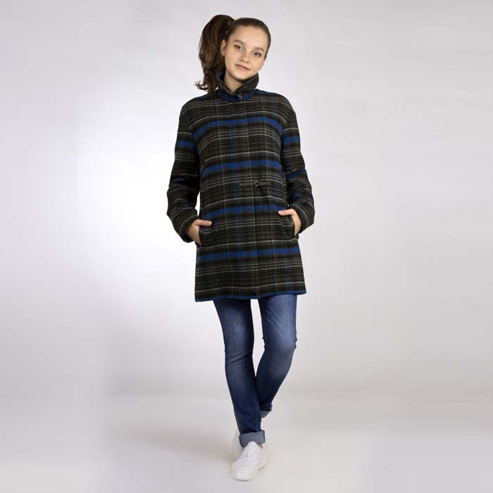 Пальто для девочки из драпа тёмно-серого цвета в синюю клетку . Силуэт прямой. Длина на 10см выше линии колена . На молнии, с ветрозащитной планкой на кнопках, на подкладке. Нижние боковые карманы на молнии. Воротник стойка. На полочке декоративная застёжка из искусственной кожи