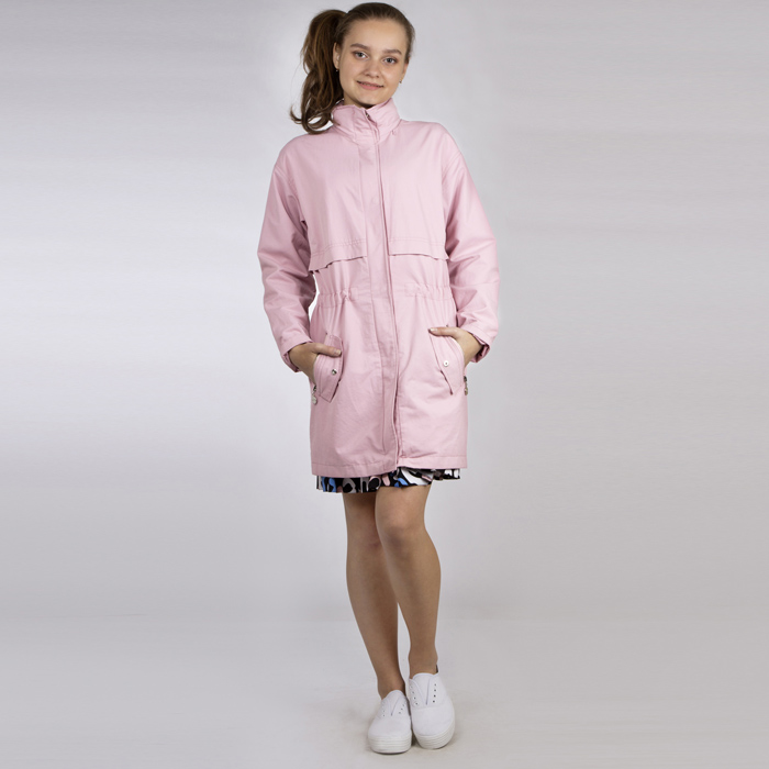 Плащ для девочки из плащёвки розового цвета с водоотталкивающей пропиткой. Силуэт прямой. Длина на 10см выше линии колена . На молнии, с ветрозащитной планкой на кнопках, на трикотажной подкладке, рукава на текстильной подкладке. Нижние боковые карманы на молнии и с клапаном на кнопке. Воротник стойка. На воротнике молния. По талии проложена резинка