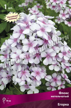 Егорка - высота растения 70см, размер цветка 2,5 см. Белый с сиреневыми теными и неярким пурпурным глазком. Цветок звездчатой формы с загнутыми вперед лепестками. Соцветие овально-коническое, многоцветковое, плотное. Очень неприхотлив, быстро разрастается, легко размножается.
