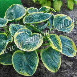 Шуга Дэдди: высота до 50 см. Листья большие, гофрированные, чашевидной формы, голубые с широкой неравномерной кремово-желтой каймой.