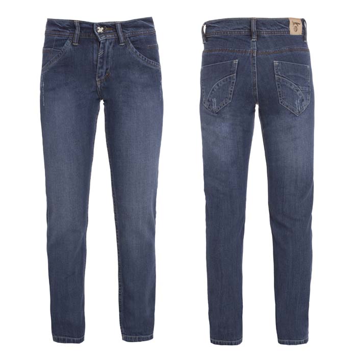 Джинсы для девочки синего цвета. На передних половинках боковые карманы и часовой. На задних половинках кокетки и два накладных кармана.