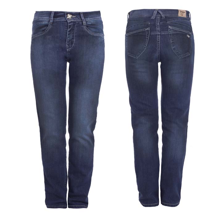 Джинсы для девочки тёмно-синего цвета. На передних половинках боковые карманы и часовой. На задних половинках кокетки и два накладных кармана.