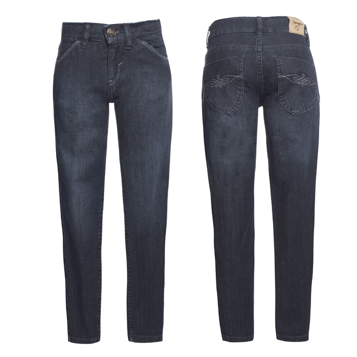 Джинсы для девочки синего цвета. Силуэт SLIM. Посадка стандартная. На передних половинках боковые карманы и часовой. На задних половинках кокетки и два накладных кармана.