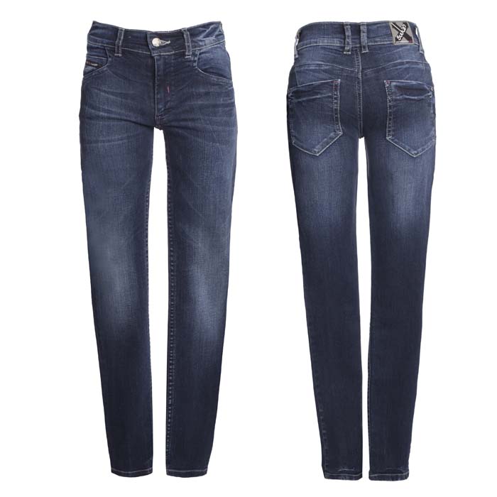 Джинсы для девочки тёмно-синего цвета. Силуэт SLIM. Посадка стандартная. На передних половинках боковые карманы и часовой. На задних половинках кокетки и два накладных кармана.