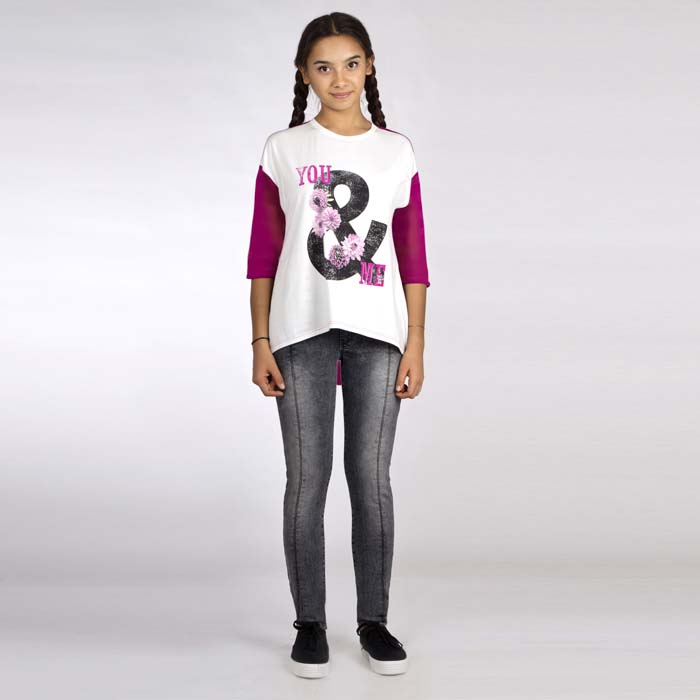 Туника для девочки из трикотажного материала малинового цвета в полоску. Полочка из кулирки контрастного цвета . Длина на 3-4см ниже линии подъягодичной складки. Силуэт COMFORT. Спущенная линия плеча. Принт полочки выполнен экокрасками