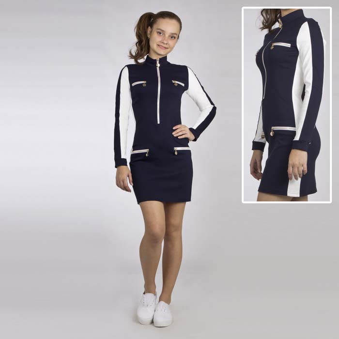 Платье для девочки из трикотажного материала тёмно-синего цвета . Длина на 10см выше линии колена. Силуэт REGULAR. Вставки полочек, спинки, рукавов из трикотажного материала контрастного цвета. Воротник стойка. Застёжка полочки на молнию. Верхние и боковые карманы на молнии.