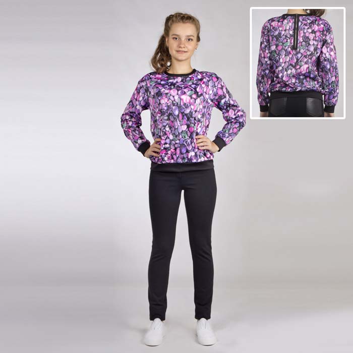 Джемпер для девочки из плотного атласа с фиолетовой набивкой. Длина стандартная. Силуэт REGULAR. Воротник, притачной пояс по низу и манжеты из трикотажного материала. На полочке застёжка молния