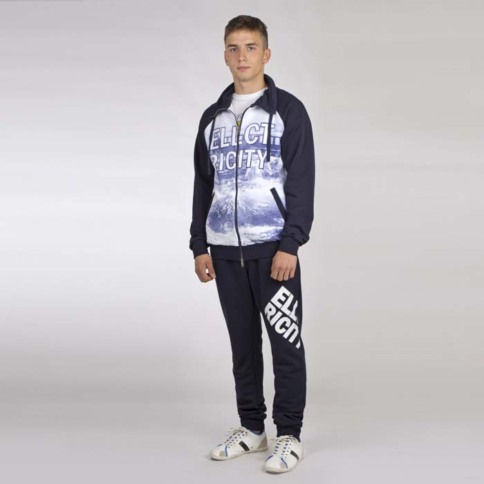 Брюки для мальчика из футора тёмно-синего цвета. Посадка стандартная. Силуэт REGULAR. Пояс на резинке, продет шнур. На задних половинках накладные карманы, на передних боковые карманы. Принт на левой передней половинке выполнен экокрасками