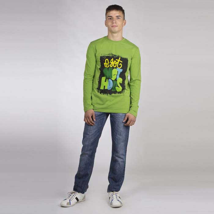 Джемпер для мальчика из трикотажной кулирки зелёного цвета. Длина стандартная. Силуэт REGULAR. Принт полочек выполнен экокрасками