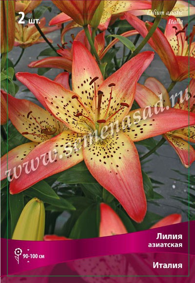 Италия - высота растения 90-110см, цветок двухцветный, желтый центр, темно-розовые концы, темно-красный крап, диаметр 17см.
