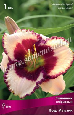 Бодэ Мьюзик - высота растения 60см, цветок кремовый с темно-сливовым пятном и выразительной каймой, горло зеленое, крупный, гофрированный, повторное цветение. Цветение июль-август.