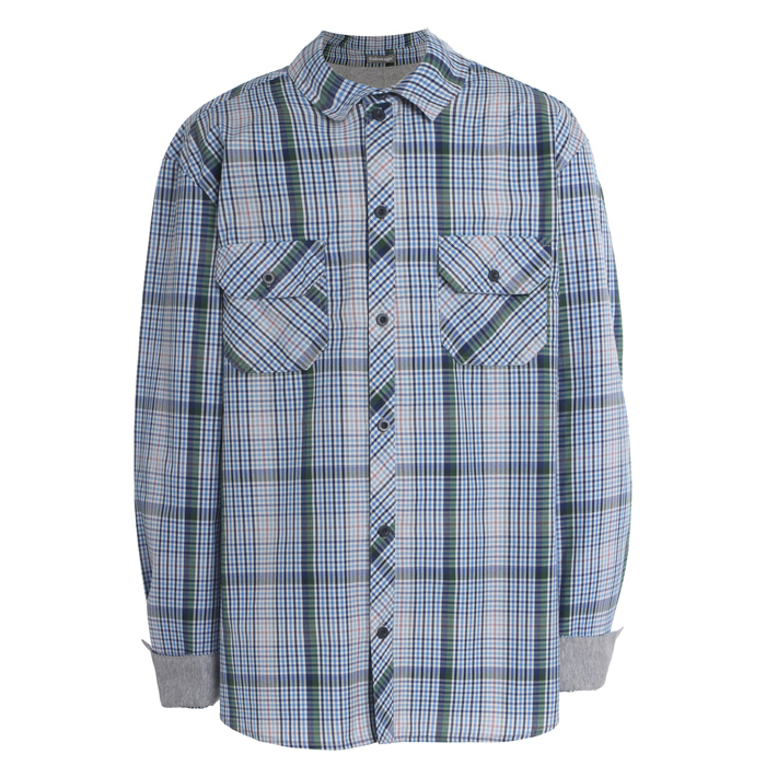 Рубашка для мальчика из текстиля в бирюзовую клеку. Длина стандартная. Силуэт REGULAR. На полочке накладные карманы с клапаном с застёжкой на пуговицу. Застёжка полочек на пуговицы. Рукава на манжете с застёжкой на пуговицы. Спинка из трикотажной кулирки контрастного цвета. На спинке принт выполнен экокрасками