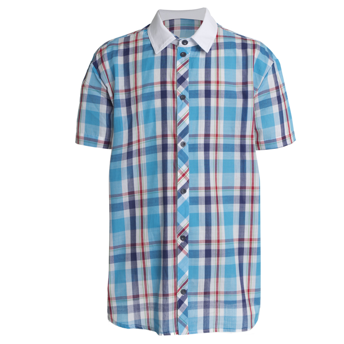 Рубашка для мальчика из текстиля в синюю клетку . Длина стандартная. Силуэт REGULAR. Застёжка планка полочек на пуговицы. Полочка и воротник контрастного цвета. Принт полочки выполнен экокрасками