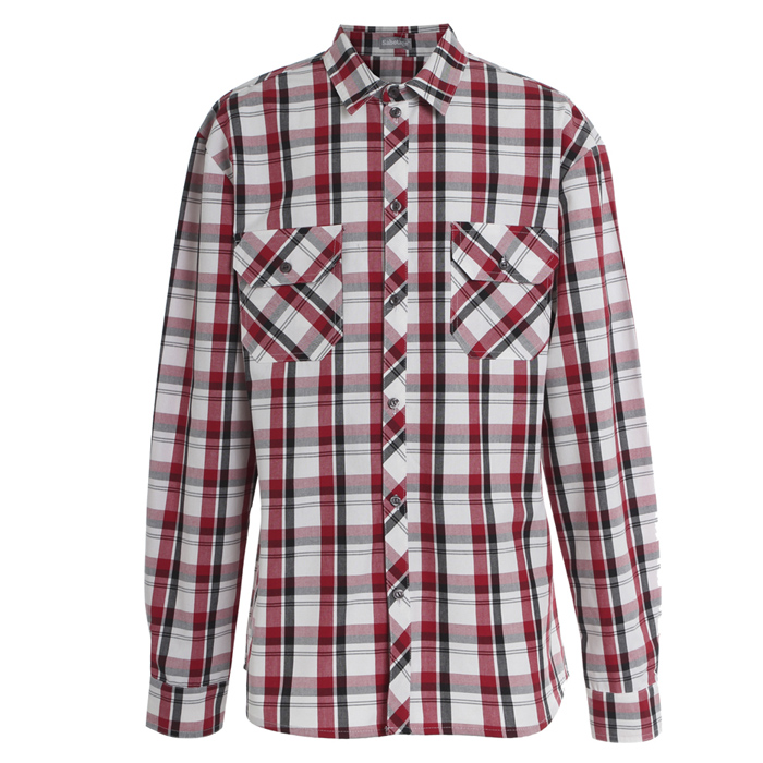 Рубашка для мальчика из текстиля в малиновую клетку. Длина стандартная. Силуэт REGULAR. Застёжка планка полочек на пуговицы. На полочке два накладных кармана с клапаном с застёжкой на пуговицу.
