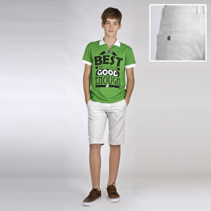 Шорты для мальчика из текстиля бежевого цвета. Посадка стандартная. Силуэт COMFORT. Длина на 5-7 см выше линии колена. В пояс проложена регулируемая резинка. На задних половинках карманы с листочкой с застёжкой на пуговицу.