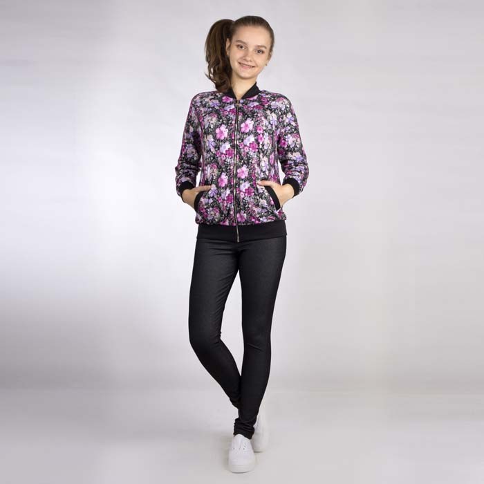 Жакет для девочки из трикотажного материала чёрного цвета с цветами . Длина стандартная. Силуэт прямой. Рукав реглан. Застёжка на молнию. Боковые карманы с листочкой контрастного цвета. Притачной пояс по низу, манжеты и воротник стойка из вязанного трикотажа контрастного цвета