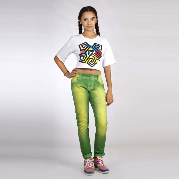 Футболка для девочки из трикотажной кулирки белого цвета . Длина до линии талии. Силуэт REGULAR. Принт полочки выполнен экокрасками