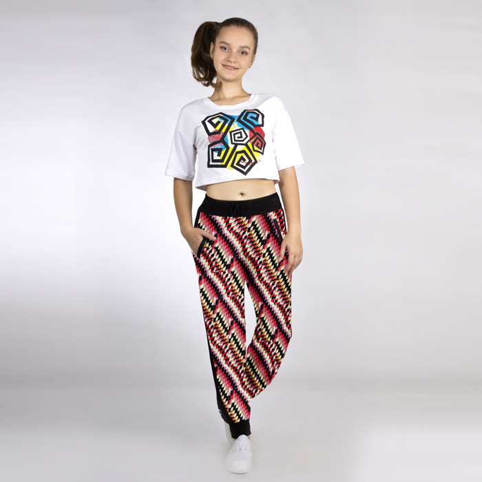 Брюки для девочки из текстиля с разноцветной набивкой. Посадка стандартная. Силуэт COMFORT. Пояс на резинке, продет шнур. По бокам вствки контрастного цвета