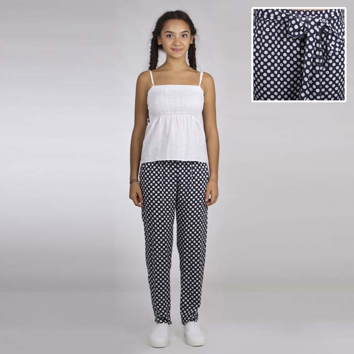 Брюки для девочки из текстиля тёмно-синего цвета в белый горох. Посадка стандартная. Силуэт COMFORT. Пояс на резинке. Брюки с поясом-завязкой