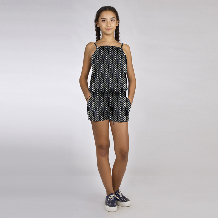 Полукомбинезон для девочки из текстиля с набивкой тёмно-синего цвета. Посадка стандартная. Силуэт расширенный. Длина ниже линии подъягодичной складки на 5-7см. Пояс на резинке. На передних половинках карманы. Бретели регулируемые. На спинке потайная застёжка на молнию