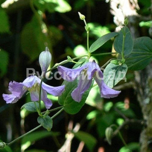 Клематис ботанический Ханна - красивая среднерослая лиана. Летом покрыта массой цветков: колокольчиковидных, слегка свешивающихся, со светло-голубыми лепестками, со светлой, лилово-розовой полоской снаружи и красиво сочетающимися жёлтыми тычинками. Здоровый нетребовательный сорт. Довольствуется средними почвами.