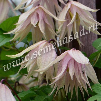 Польский сорт в продаже с лета 2012 г. Цветки всегда махровые - как на прошлогодних побегах, так и на побегах текущего года, относительно крупные для группы Атрагене (диаметром 10-12 см), колокольчикообразные, свешивающиеся, слегка приятно пахнущие грейпфрутом, сидящие на пурпурных цветоножках. Цветки складываются из 4 эллипсообразных, вытянутых, остро заканчивающихся со слегка волнистыми краями чашелистиков, на внешней стороне кремово-розовые, снизу светло-розовые , иногда почти кремового цвета. Цветет в мае и повторяет цветение, но уже менее обильно -летом. Имеет красивые темно-зеленые относительно крупные (до 23 см длиной и 19 см шириной) листья - тройные, тройчатосложенные, с красивой фактурой и зубчатыми краями листочками. Достигает высоты 2 - 3 м. За опоры цепляется листовыми черешками. Морозостоек и неприхотлив.