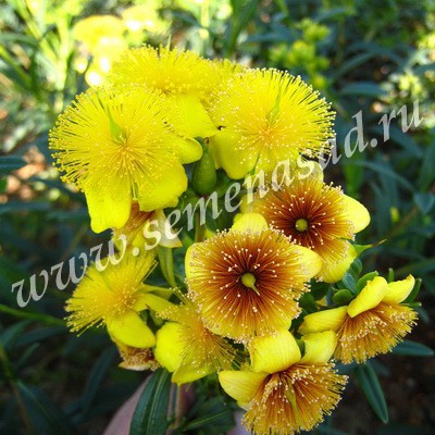 Кустарник высотой 0,6-0,8 м, шириной 0,8-1,2 м. Крона раскидистая. Листья вечнозеленые, ланцетные, свеже-зеленые. Цветет с июля по сентябрь. Цветки крупные, золотисто-желтые, многочисленные. Растет умеренно быстро.