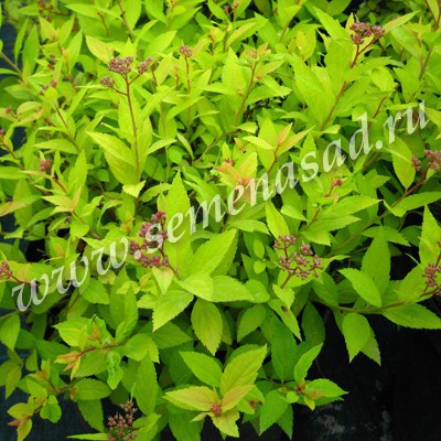 Неприхотливый кустарник с компактной, плоской, шаровидной кроной. Листья ярко-желтые в течение всего сезона. Цветки розовые в плоких соцветиях.